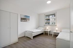 This roomy apartment comprises three bedrooms with six beds in total, a fully equipped kitchen complete with a stovetop, oven, microwave, refrigerator, dishwasher and all necessary kitchenware. Guests will appreciate the washing machine as well as tea and coffee making facilities. The private bathroom includes both a bathtub and shower.